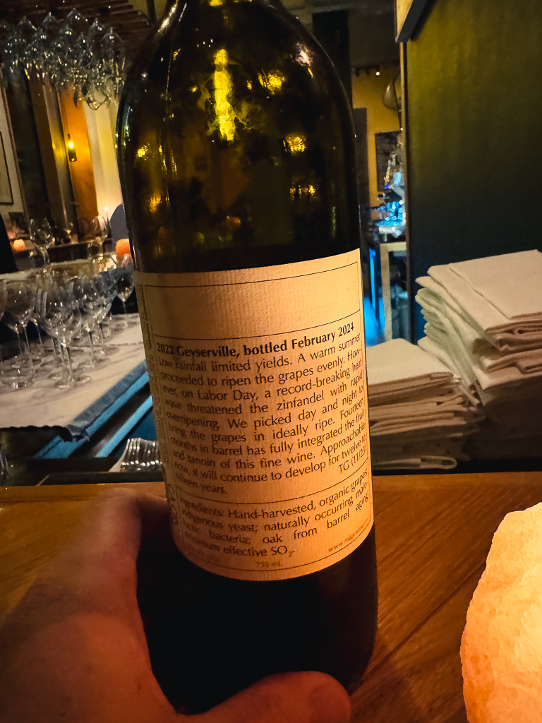 Jan Jaap bracht een doorsnede van de portfolio mee. Alleen recente jaargangen, helaas. Ridge-wijnen hebben doorgaans meerdere jaren flesveroudering nodig voor ze op piek staan. Vanavond zien we ze in jeugd. Iets te vroeg, eigenlijk. Maar leerzaam: zo weet je waar de wijn over 8 tot 15 jaar vandaan komt.