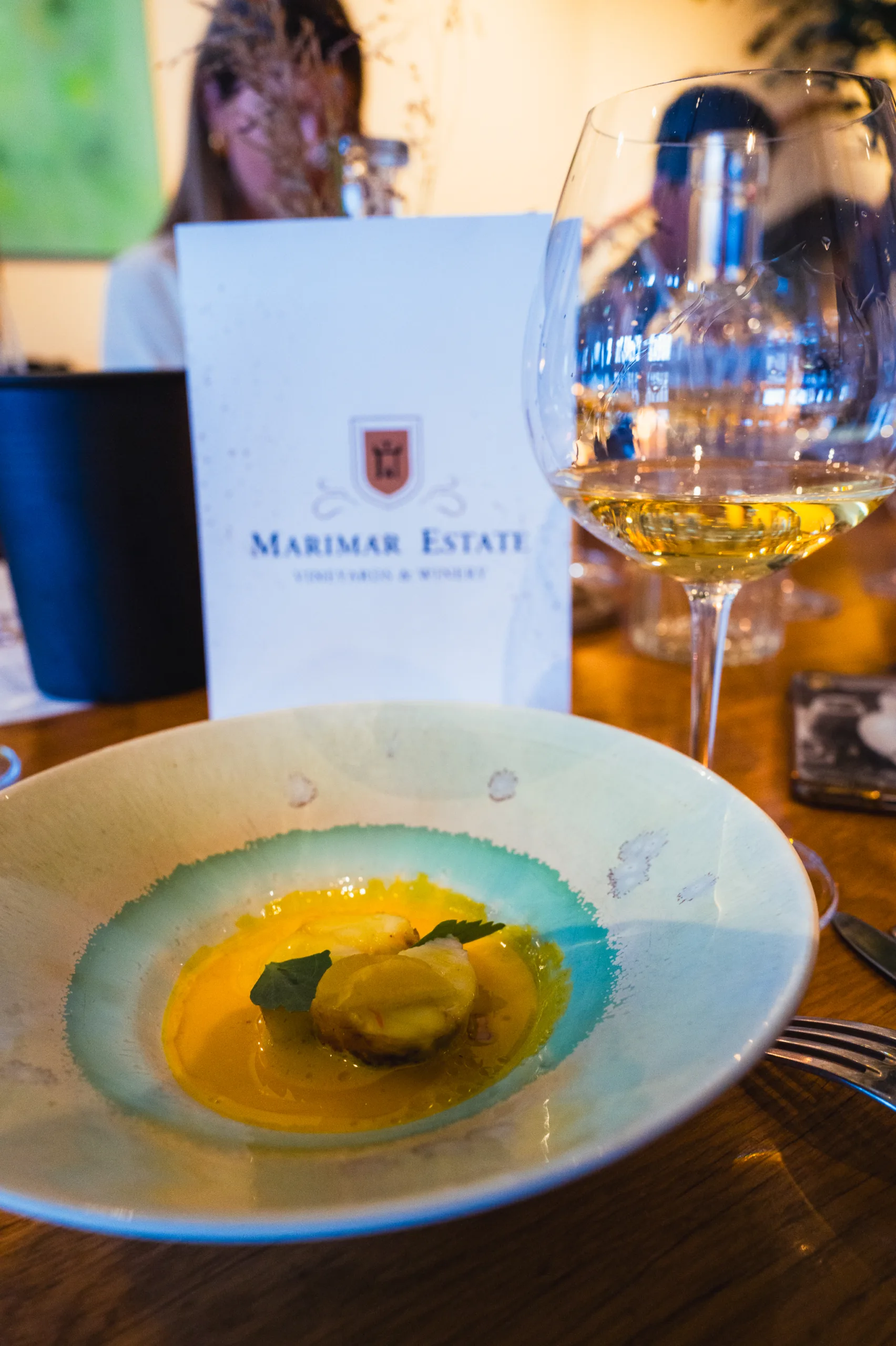 Tussenschotel: Zeeduivel met saffraan en pijnboompitten. La Masía Chardonnay 2021.