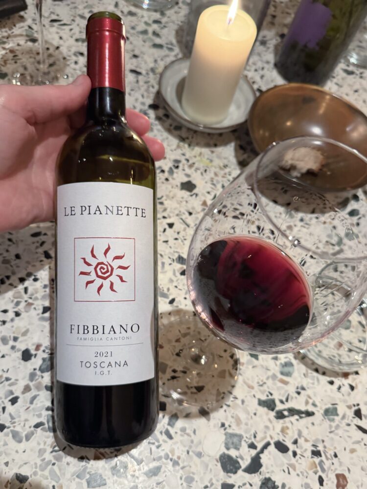Le Pianette IGT Toscana (2020). 70% Sangiovese, 30% Colorino. Klassiek robijnrood, bakkerskruiden in de neus, kers in de mond, zachte tannines. In mijn aantekeningen staat “kruidig” en “comfortwijn”; iets ruwer dan een gepolijste internationale stijl, en dat is precies de bedoeling.