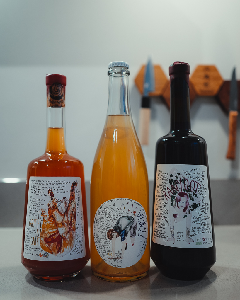 De drie flessen voor mij laten zien hoe ver het domein gaat in puur natuurlijk werken. Hun oranjewijn La Griffe de Gniff 2022 is een blend van Muscat, Gewürztraminer, Pinot Blanc en Pinot Gris. Pet’Gab’La 2023 is een pétillant naturel van 100% Pinot Auxerrois, en Ranyoot 2023 is een rode wijn van pure Pinot Noir met semi-koolzuurmaceratie. Geen sulfiet, geen filtratie, geen klaring.