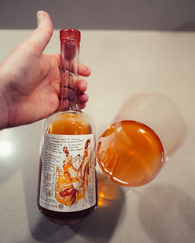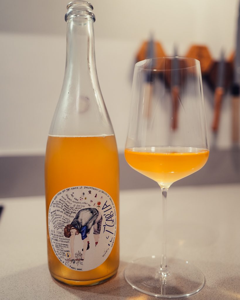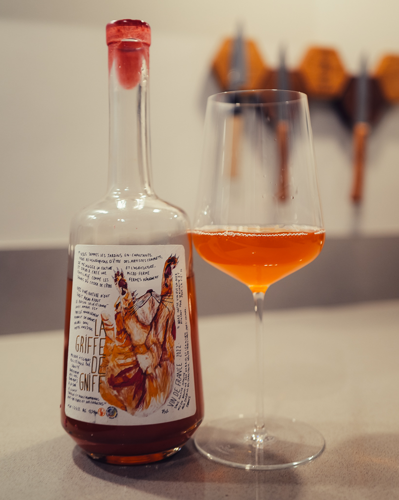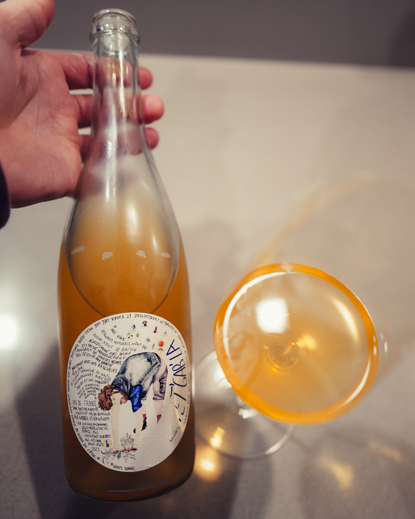 Met deze drie wijnen voor me trok de oranjewijn me eerst aan op kleur. De pét-nat tikte nog door, dus ik vreesde een uitbarsting bij het opentrekken. Niets daarvan.