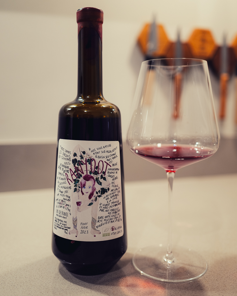 100% Pinot Noir, 29 dagen semi-koolzuurmaceratie, zonder additieven. Donkerrood met violette tinten, een zuivere neus van rood fruit en wat aardse onderlaag. De semi-koolzuur geeft frisheid zonder de elegantie van Pinot weg te halen, wat hier het hele punt is. Licht gekoeld op 14-16°C bij paddenstoelrisotto of gebakken eendenborst.