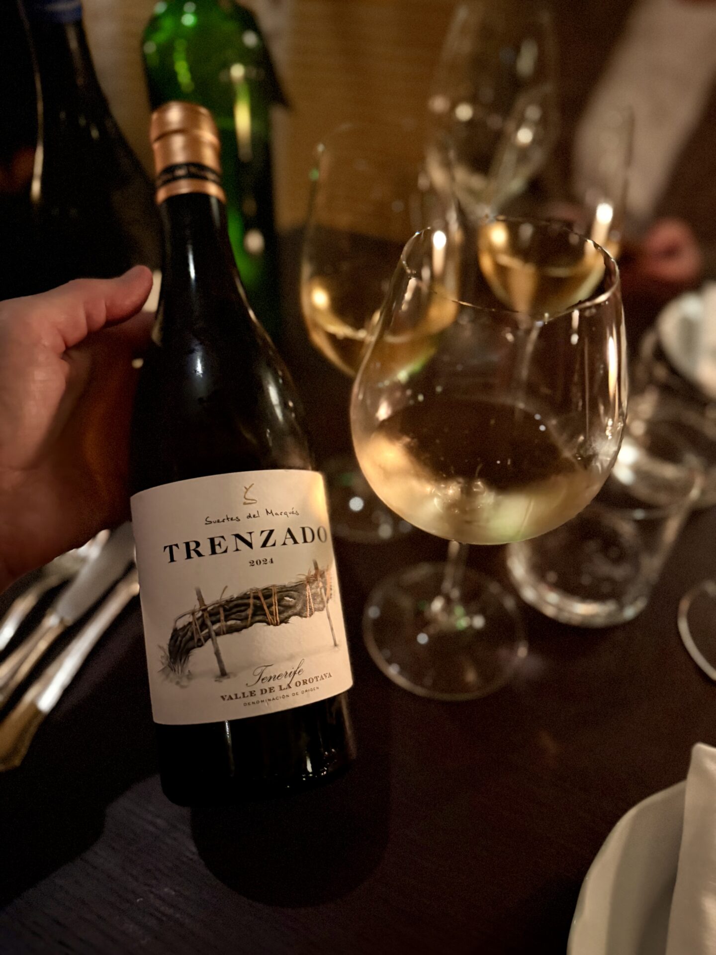 Hier werd het interessant. Lars schonk ons Trenzado 2021 uit Valle de la Orotava op Tenerife in, en eerlijk gezegd; wanneer zag je voor het laatst Canarische eilandenwijn op een Amsterdamse kaart? Mineraalachtig, zout, bijna rokerig: deze vulkanische expressie transporteerde ons rechtstreeks naar zwart zandstranden en Atlantische winden. Gedurfd programmeren dat prachtig uitpakte.