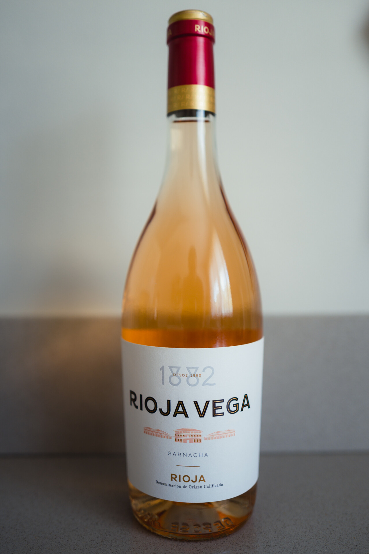 De donkerrode, fruitige rosado uit Rioja kent iedereen — dieproze, vol, met de tannines van een lichte rode wijn. De Rioja Vega 1882 Rosado loopt een andere route. Bleek zalm in het glas, witte bloemen op de neus, rond, fris en kruidig op het gehemelte. Dit is Rioja Moderna, en het werkt.