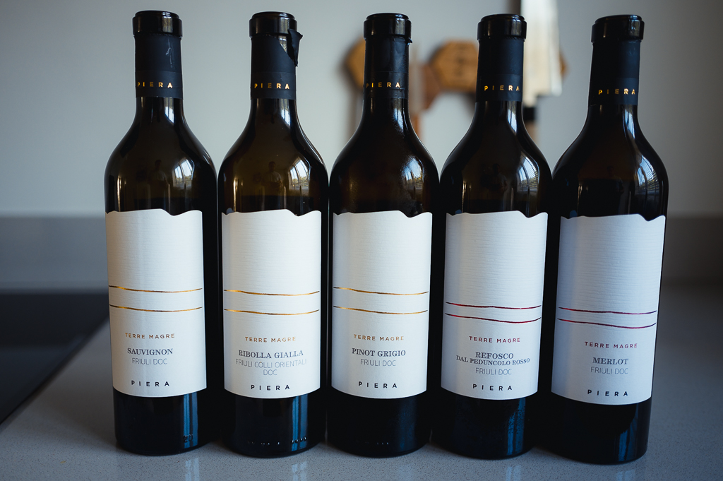 Vijf flessen op tafel, vijf keer Friuli. Schoon, vers, expressief; elke wijn vertelt zijn druif én zijn plek.