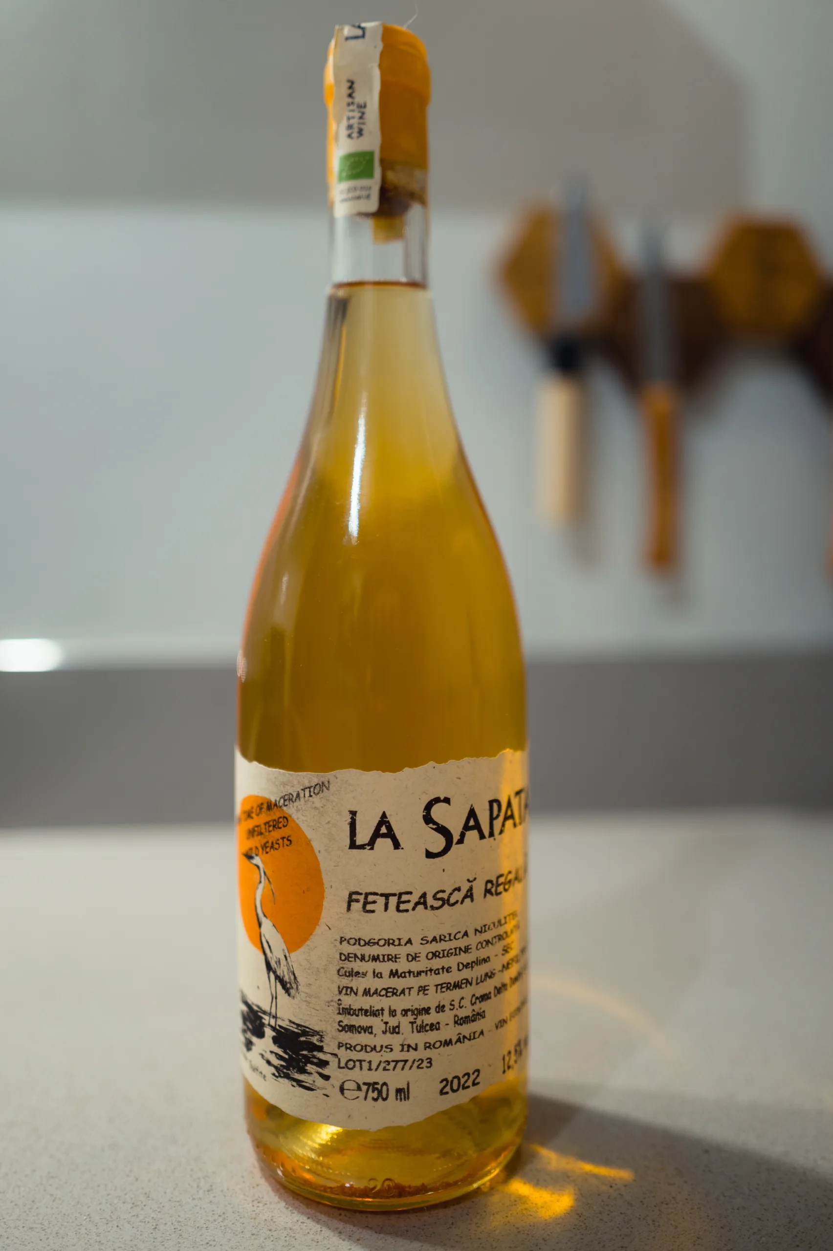 La Sapata’s Feteasca Regala komt uit het oosten, dicht bij de Donaudelta. De grond bevat fossiele schelpenlagen en wordt omgeven door beschermde natuurgebieden. La Sapata zet in op biologisch en lokaal; wilde gist en sulfiten voor stabiliteit. Deze frisse oranjewijm is gemaakt van 100% inheemse ‘feteasca regala’ druiven, met een vleugje bitterheid en noten van sinaasappelaanzet.