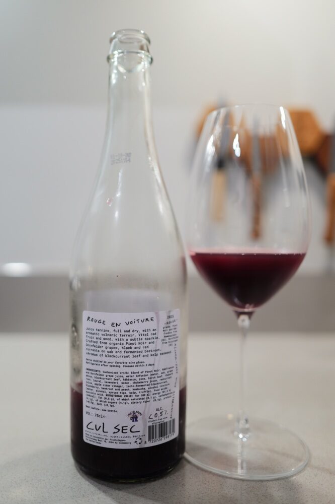 Rouge en Voiture is one of four bottles in Cul Sec’s 2025 cuvée, all under 0.5 percent alcohol. They sit in conversation with wine rather than imitating it. Compare it to kombucha: it uses fermentation but doesn’t claim to be beer. Cul Sec uses wine grapes, terroir thinking, oak aging and fermentation techniques, but builds something categorically distinct.