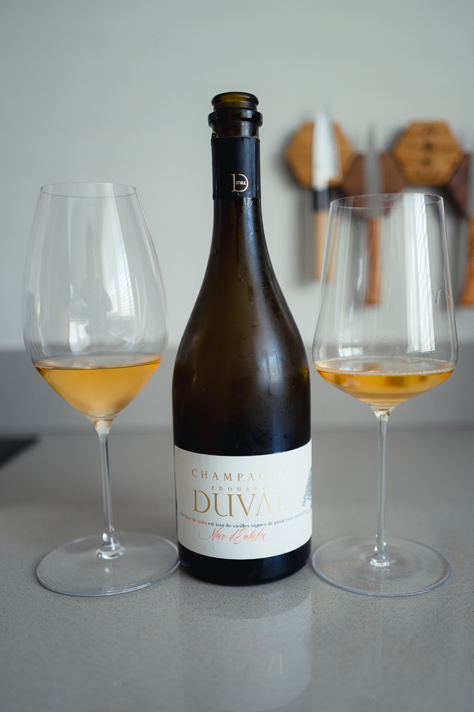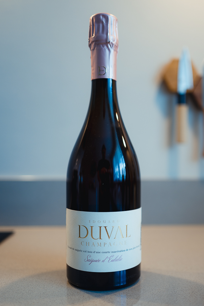 Ik heb contact opgenomen met het wijnhuis en raad eens? Edouard Duval, de eigenaar zelf, antwoordde! We hadden een geweldig videogesprek waarin ik veel leerde over de flessen en hun verhalen. Ik kreeg ook vier van de elegantste en mooiste champagnes te proeven die je je maar kunt voorstellen. Het is estate champagne, 100% hun eigen single monopole uit de Côte des Bar, verspreid over één grote heuvel.